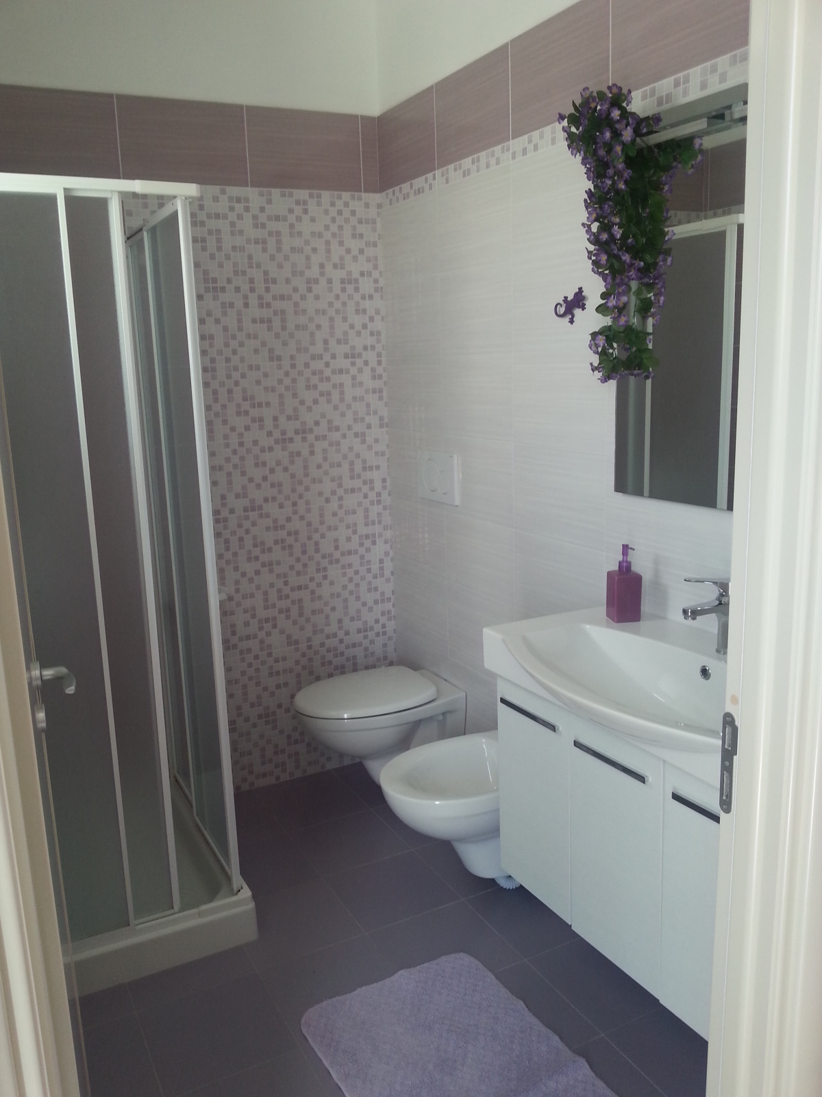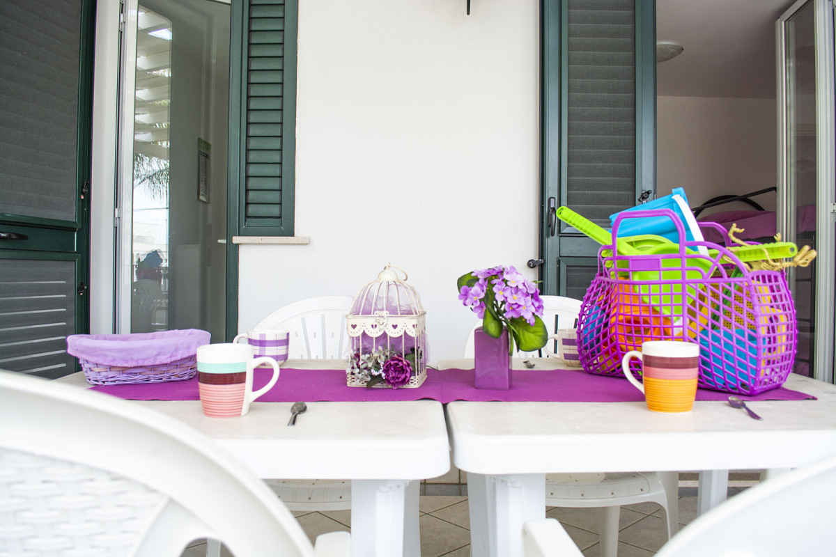 Situato al primo piano di una graziosa struttura, questo appartamento accogliente e luminoso offre un ambiente curato nei dettagli, con arredi nei toni del viola che richiamano il profumo e la delicatezza dei fiori mediterranei.