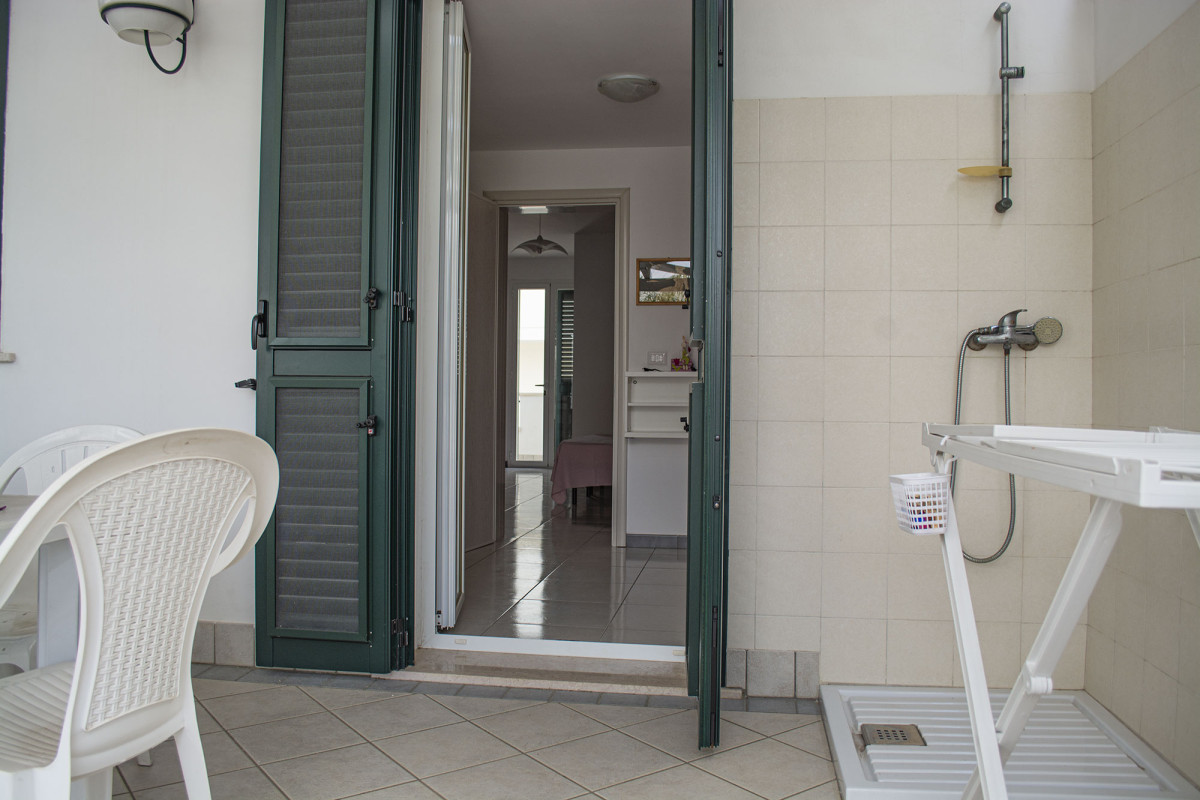 All’esterno, un terrazzo attrezzato con tavolo e sedie da giardino ti permetterà di goderti colazioni o cene all’aperto, mentre la doccia esterna è perfetta per rinfrescarsi dopo una giornata di mare.