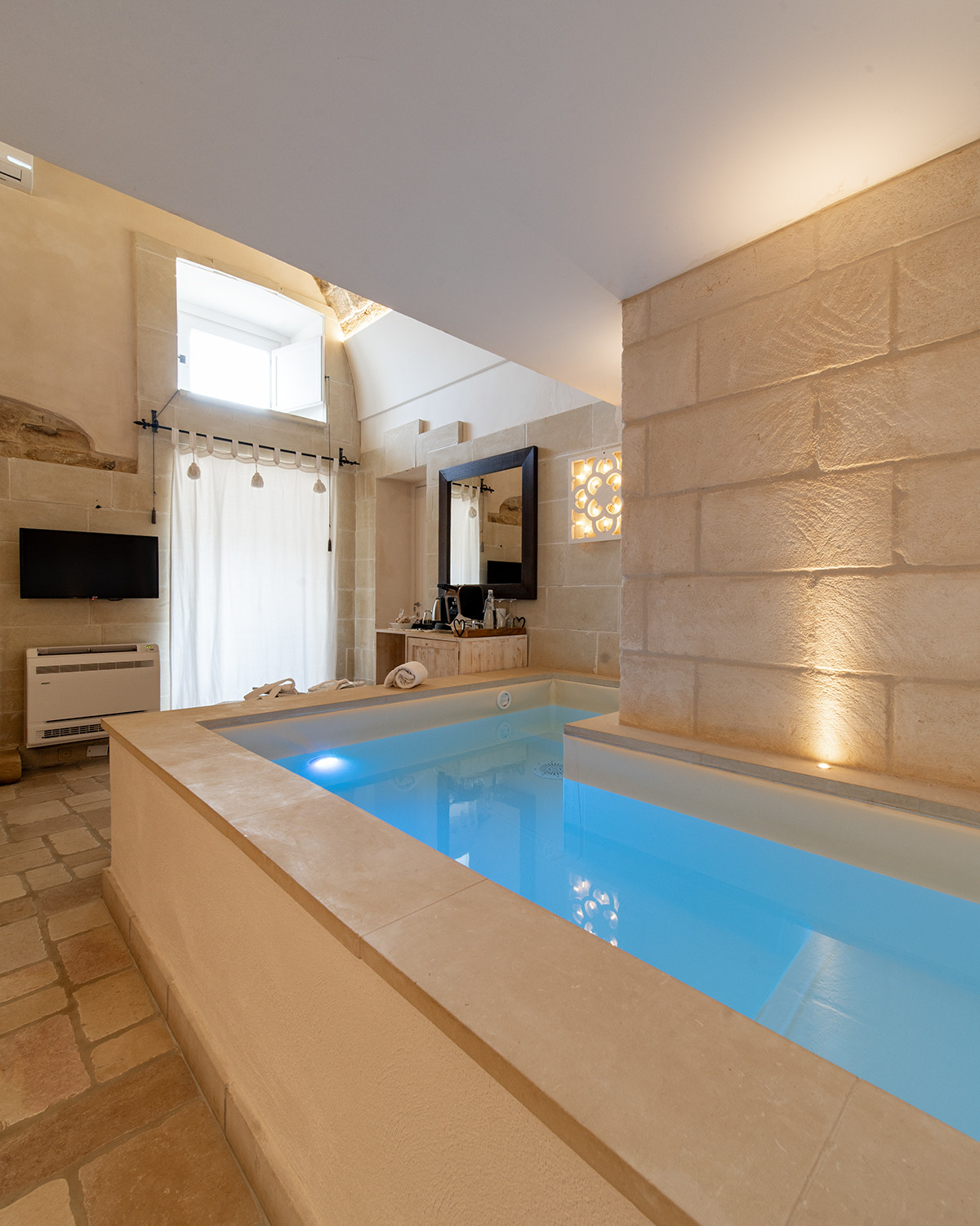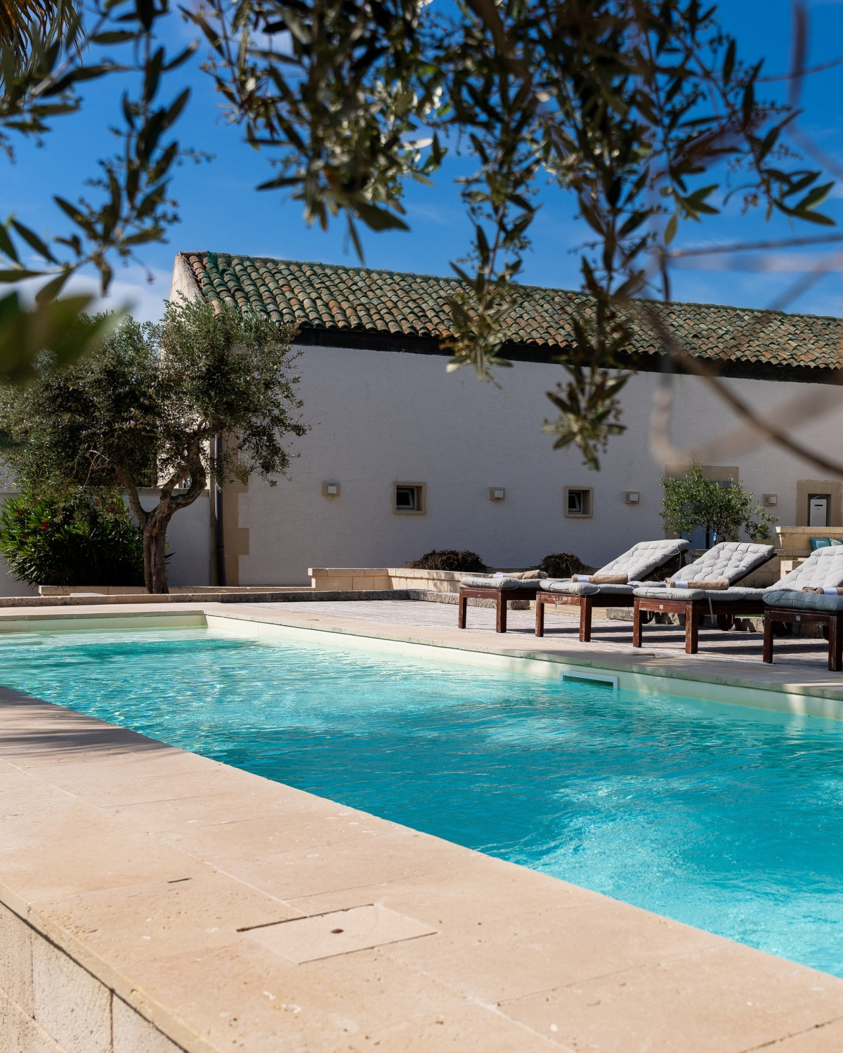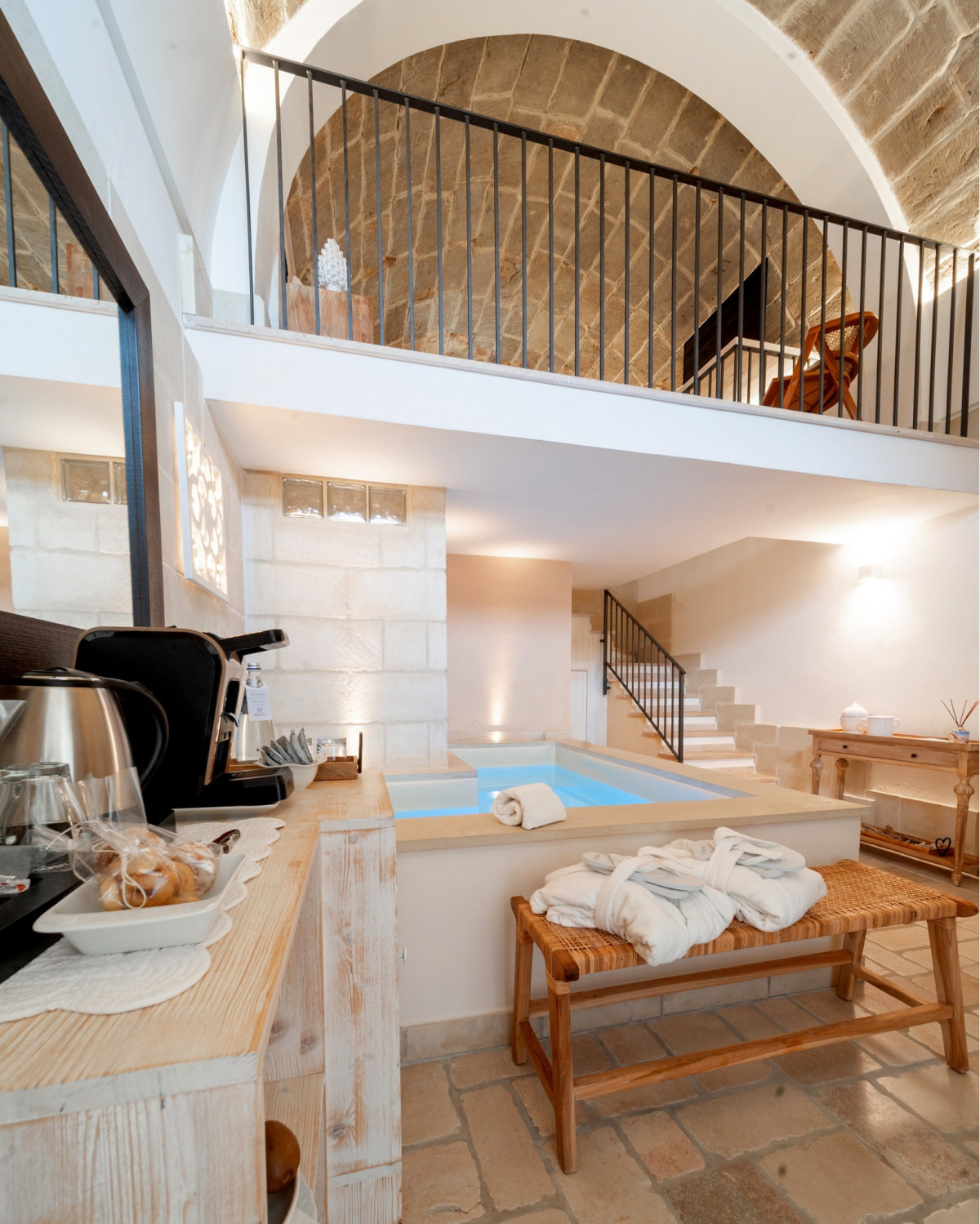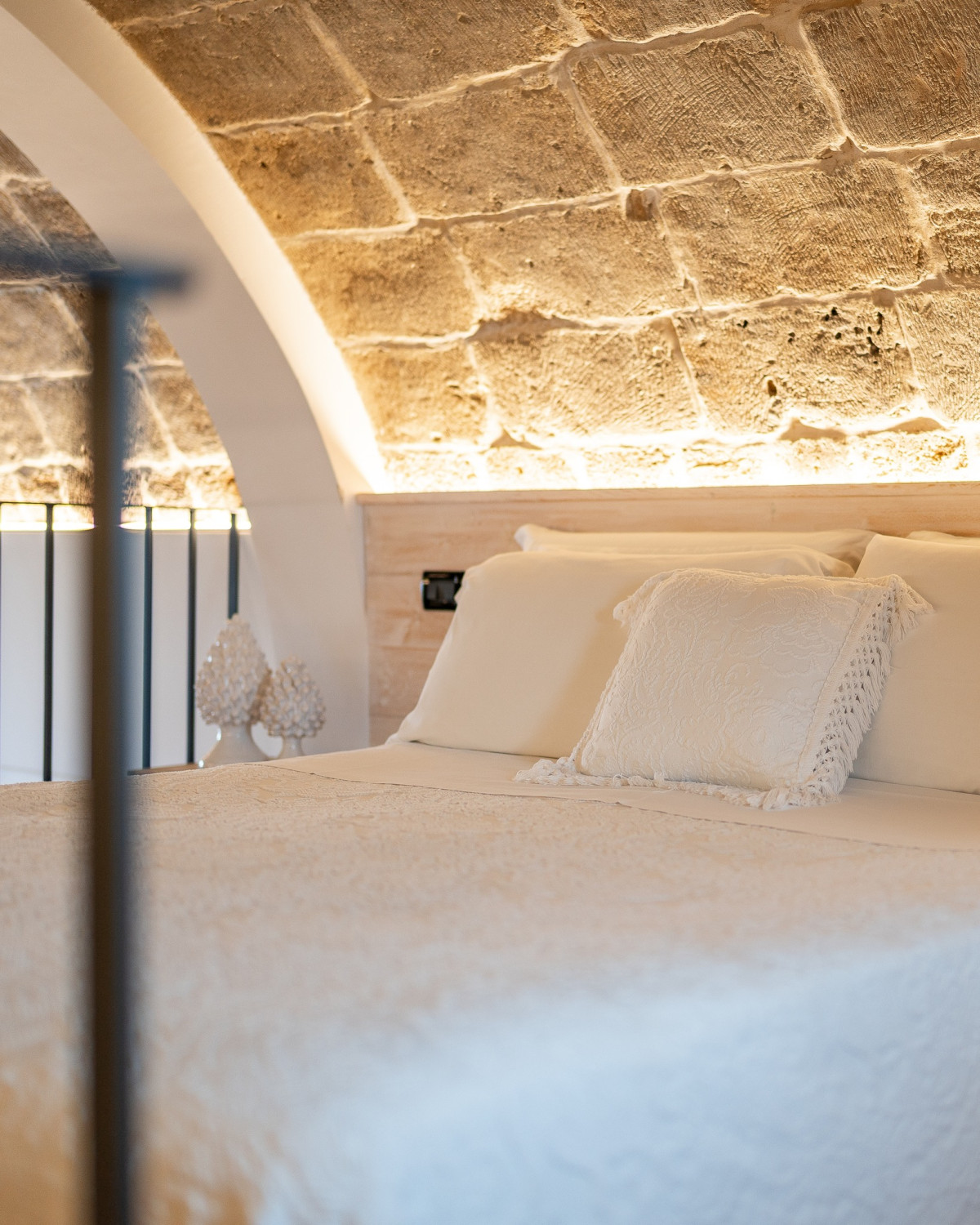 La struttura dispone di camere e suite arredate con gusto, ognuna diversa dall’altra, dove materiali naturali e dettagli della tradizione salentina si fondono con comfort moderni.