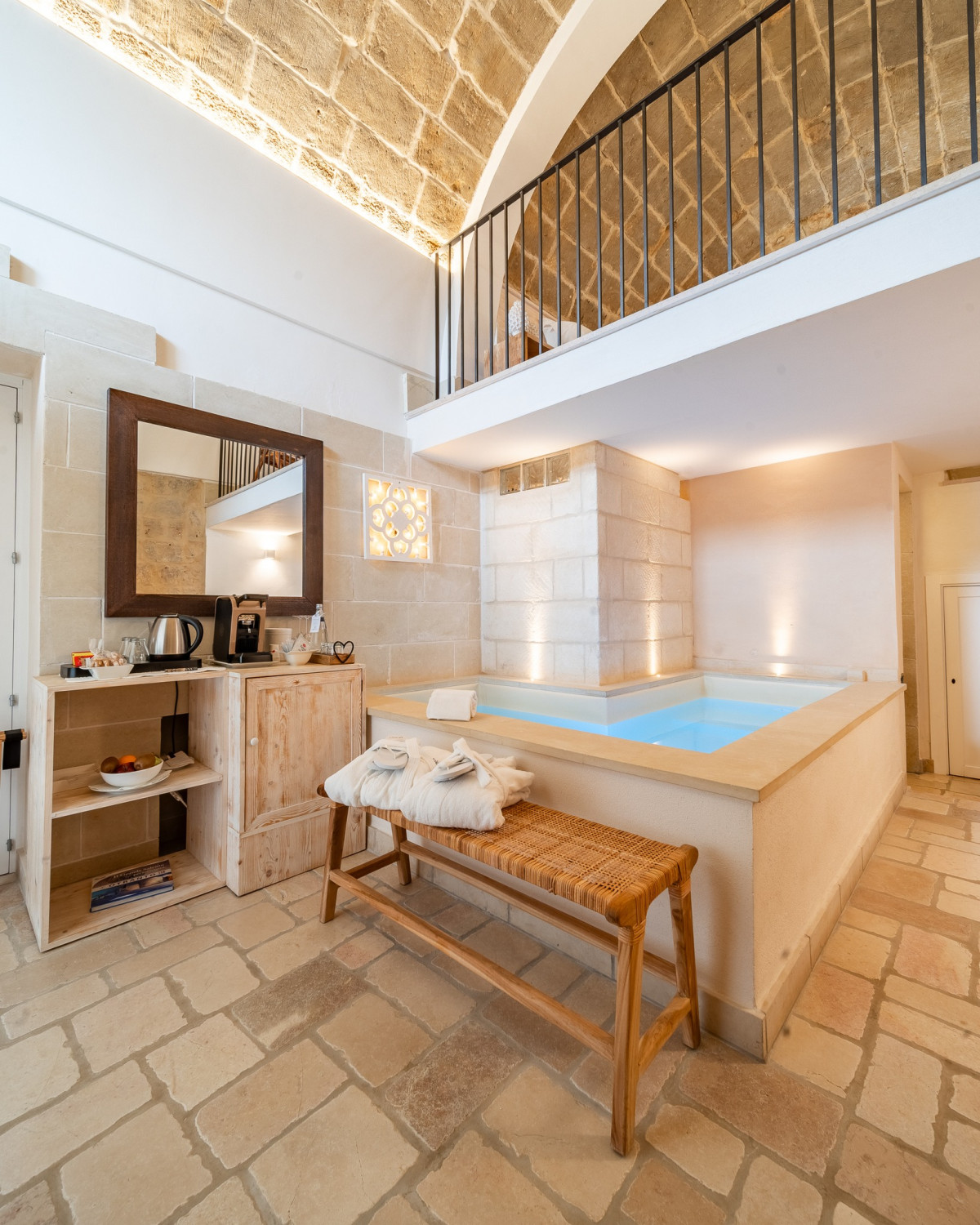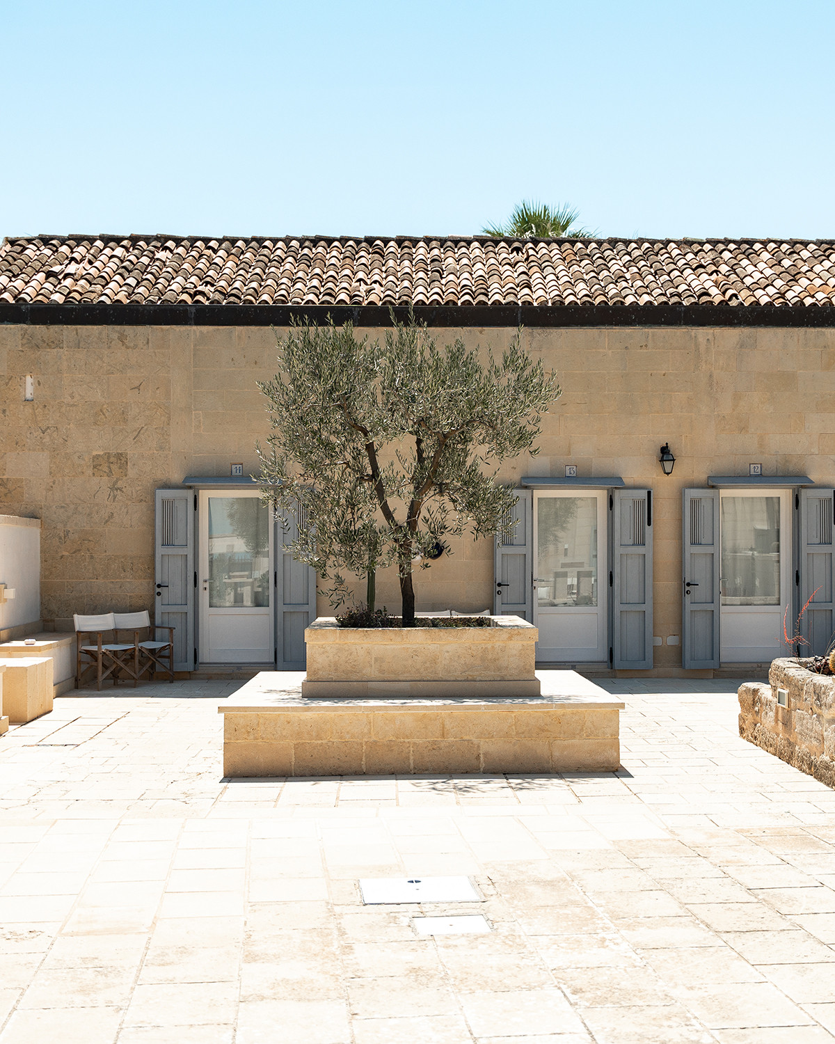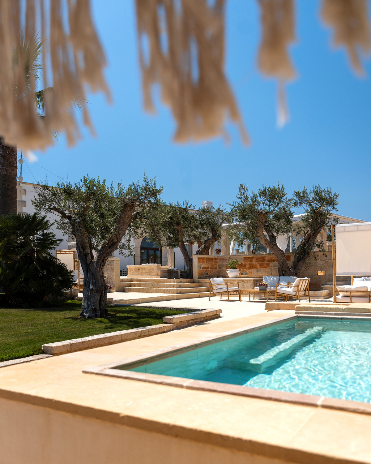 La struttura dispone di camere e suite arredate con gusto, ognuna diversa dall’altra, dove materiali naturali e dettagli della tradizione salentina si fondono con comfort moderni.