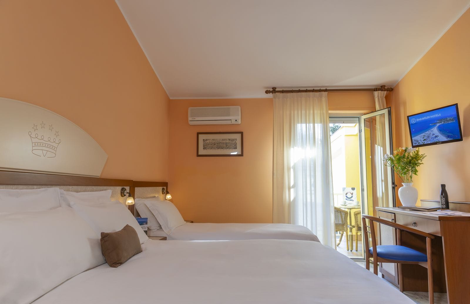 Camere Standard (circa 25 Mq) per 2/3 persone, composte da un unico ambiente con letto matrimoniale, letto singolo aggiuntivo e bagno con doccia, situate al primo piano e accessibili tramite scale, ogni camera dispone di un balcone privato.